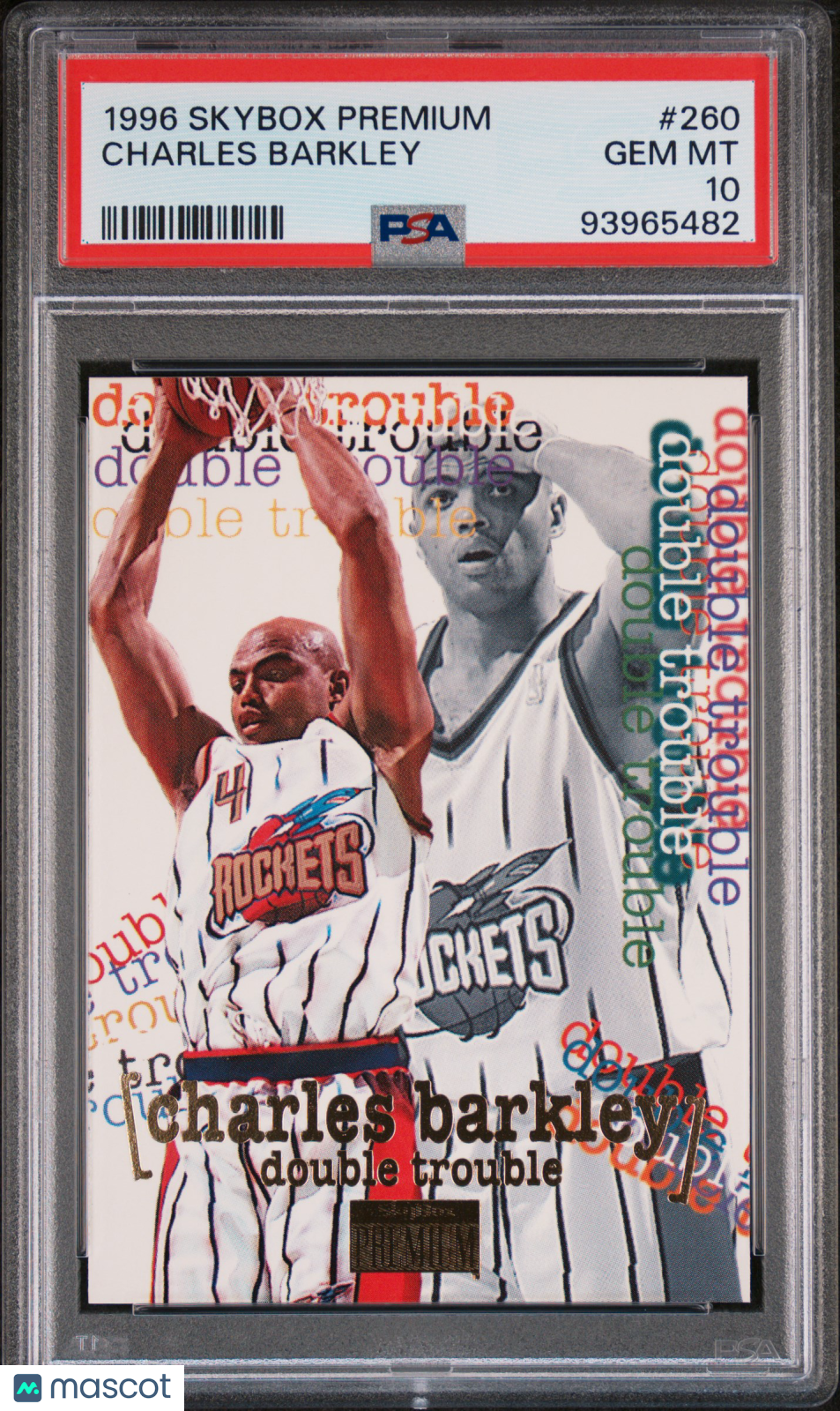 1996 Skybox Premium Charles Barkley #260 PSA 10 Up for grabs is a stunning 1996 Skybox Premium Charles Barkley #260 basketball card, professionally graded PSA 10—Gem Mint! This rare collectible celebrates Barkley during his legendary 1996 season, an era when he continued to dominate the court and solidify his Hall of Fame legacy. With only 22 cards at this grade and none higher, this is a must-have for serious collectors and NBA fans looking to invest in a true piece of basketball history. Don’t miss your chance to own this highly sought-after card, featuring vibrant Skybox design and pristine condition. Charles Barkley’s impact on the game, especially in the mid-90s, makes this card a standout addition to any collection. Secure this gem today and showcase one of the rarest Barkley cards from the iconic 1996 set! Graded: Yes Population Higher: 0 Sport: Basketball Set: 1996 Skybox Premium Certification Number: 93965482 Grader: Professional Sports Authenticator (PSA) Manufacturer: Skybox Population: 22 Grade: 10 Year Manufactured: 1996 Player/Athlete: Charles Barkley Card Number: 260 Listed With Mascot.