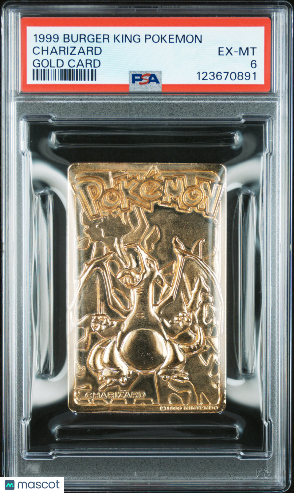 1999 Burger King Pokemon Gold Cards Charizard PSA 6 Don’t miss your chance to own a piece of Pokémon history with this 1999 Burger King Pokémon Gold Card featuring the iconic Charizard! Professionally graded a PSA 6, this collectible stands out as a must-have for fans and collectors seeking authentic 90s Pokémon memorabilia. With only 259 cards at this grade and 824 graded higher, Charizard remains one of the most sought-after Pokémon, especially from this legendary Burger King promotion that captured the excitement of the original Pokémon craze. This card comes certified by Professional Sports Authenticator (PSA) with certification number 123670891, ensuring both authenticity and value. Whether you’re adding to a vintage Pokémon collection or searching for a nostalgic gift, this Charizard gold card is a standout piece that celebrates the beloved fire-type Pokémon’s enduring legacy from 1999. Graded: Yes Population Higher: 824 Set: 1999 Burger King Pokemon Gold Cards Certification Number: 123670891 Grader: Professional Sports Authenticator (PSA) Population: 259 Grade: 6 Year Manufactured: 1999 Featured Person/Artist: Charizard Franchise: N/A Listed With Mascot.