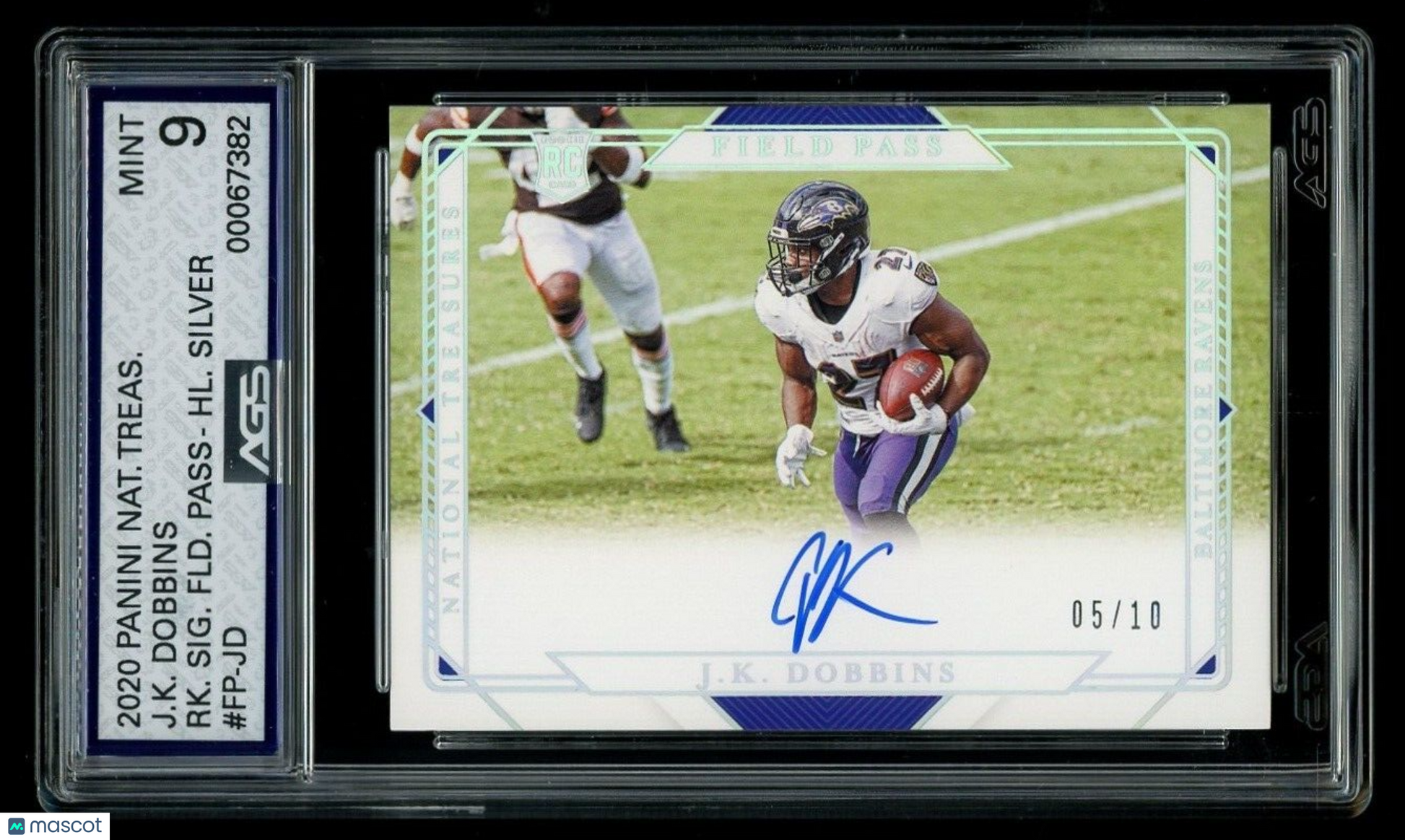 2020 National Treasures J.K. Dobbins #FP-JD Rookie Signature Silver AGS 9 Score a top-tier addition to your football card collection with this 2020 Panini National Treasures Rookie Signature Field Pass Silver of J.K. Dobbins! Graded an impressive 9 by Automated Grading Systems (AGS), this card captures Dobbins at the start of his NFL career, making it a must-have for fans and serious collectors. As a standout rookie in 2020, Dobbins showcased his explosive playmaking ability, and this certified gem is the perfect way to commemorate his breakout season. Don’t miss your chance to own this highly sought-after National Treasures parallel, featuring a bold rookie signature and premium silver finish. With its strong grade and official AGS certification, this card is ready to elevate any collection and is sure to attract attention from fellow enthusiasts. Secure this collectible today before it’s gone! Graded: Yes Sport: Football Set: National Treasures Parallel/Variety: Rookie Signature Field Pass Silver Certification Number: 00067382 Grader: Automated Grading Systems (AGS) Manufacturer: Panini Year Manufactured: 2020 Player/Athlete: J.K. Dobbins Grade: 9 Card Number: FP-JD Listed With Mascot.