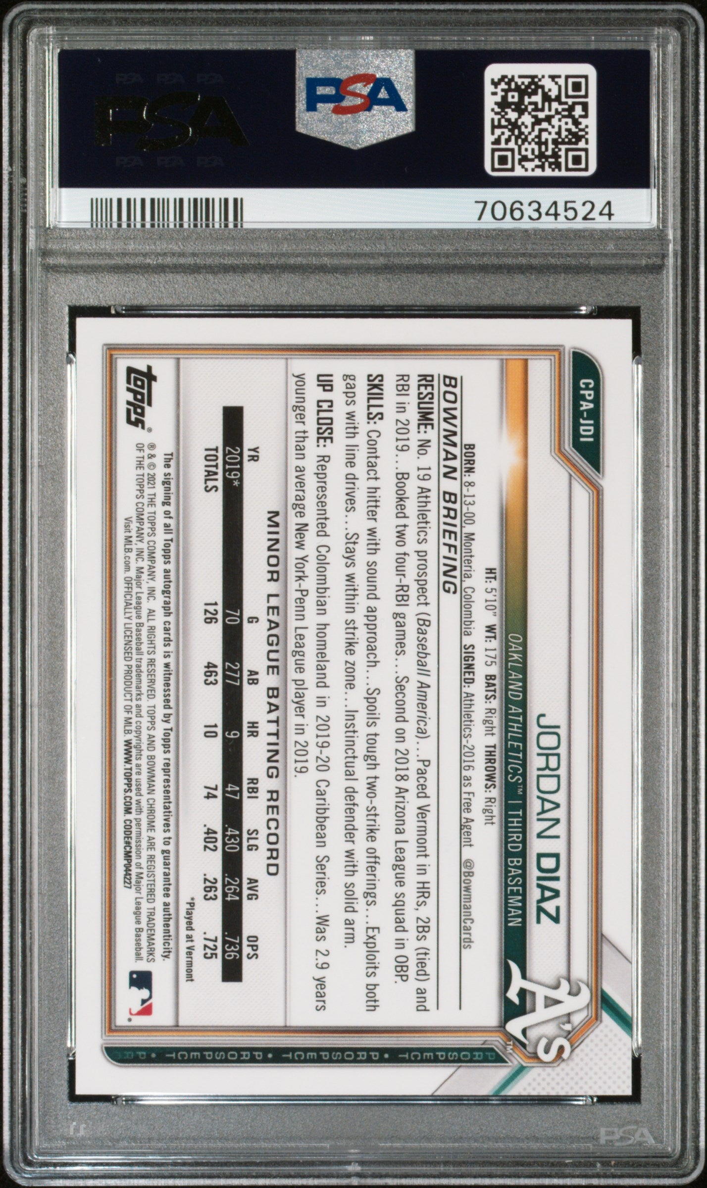 2021 Bowman Chrome Jordan Diaz #CPAJDI Prospect Autographs Red Refractor PSA 9