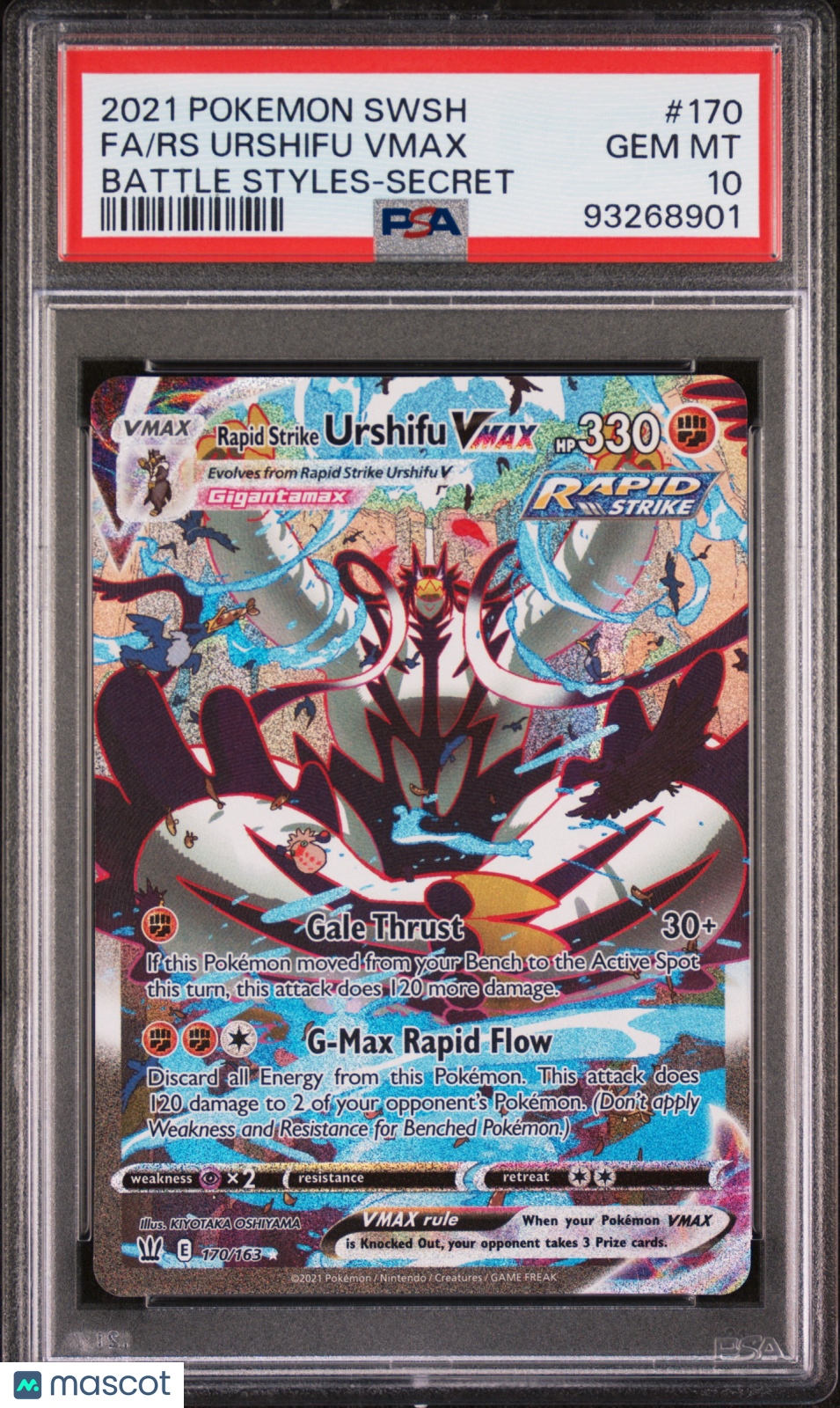 2021 Pokemon Battle Styles RS Urshifu Vmax Fa #170 PSA 10 Up for sale is a stunning 2021 Pokemon Sword & Shield Battle Styles RS Urshifu Vmax Full Art card, graded a perfect PSA 10 by Professional Sports Authenticator. This highly sought-after card features the powerful Rapid Strike Urshifu Vmax, a fan-favorite character introduced in the Sword & Shield era, known for its dynamic gameplay impact and striking artwork. With a population of 2,305 and no higher-graded examples, this card is a true gem for collectors and competitive players alike. Don’t miss your chance to own this top-tier collectible, complete with its PSA certification number 93268901 for added peace of mind. Whether you’re investing in your Pokemon TCG collection or searching for the perfect centerpiece, this RS Urshifu Vmax Fa #170 stands out as a must-have from the 2021 Battle Styles set. Graded: Yes Population Higher: 0 Set: Battle Styles Game: Pokemon Sword & Shield Character: Fa, RS Urshifu Vmax Certification Number: 93268901 Grader: Professional Sports Authenticator (PSA) Manufacturer: Pokemon Population: 2305 Grade: 10 Year Manufactured: 2021 Card Number: 170 Listed With Mascot.