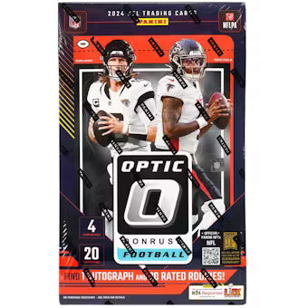 The 2024 Donruss Optic Football Hobby Box blends the classic Donruss aesthetic with sleek Optichrome visuals and a hit-filled checklist. Featuring short-printed Downtowns, on-card rookie autos, and limited parallels, Optic remains one of the most anticipated football releases each year—perfect for collectors, investors, and set builders alike.